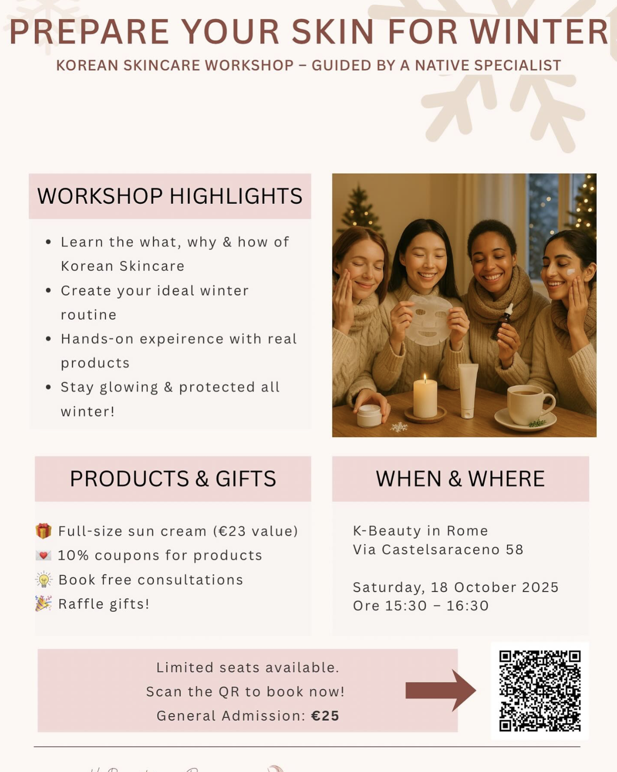 또 주목할 만한 일정은 10월 18일 '케이 뷰티 인 로마(K-Beauty in Rome)'가 주관한 워크숍 '프리페어 유어 스킨 포 윈터(Prepare Your Skin for Winter)'이다. 해당 워크숍은 로마 거주자와 방문객을 대상으로 겨울철 피부 관리법, 보습과 차단의 원리, 단계별 루틴의 과학적 근거를 실습 중심으로 가르치며 ‘한국식 스킨케어’가 왜 계절과 피부 타입에 민감하게 대응하는지를 설명할 예정이다. 이번 워크숍은 단발성 이벤트가 아닌 지난 5월과 6월에 이어 진행되는 연속 프로그램이라는 점에서 주목할 만하다. 이전 행사에서도 로마 거주자와 방문객들 사이에서 큰 호응을 얻었으며 참가자들은 SNS와 입소문을 통해 긍정적인 반응을 공유했다.