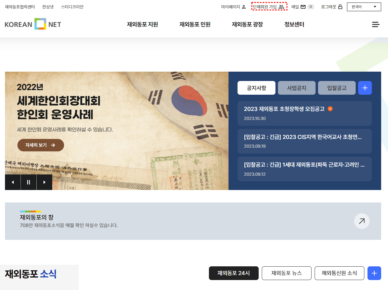 개인회원으로 로그인 후 [단체회원가입] 버튼 클릭